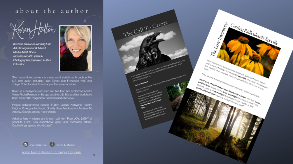 From award-winning professional Fujifilm X-Photographer, Kelbyone educator and artist Karen Hutton, who has led photo retreats from California to Europe and whose artistic work bridges the gap between technical mastery and soul expression.