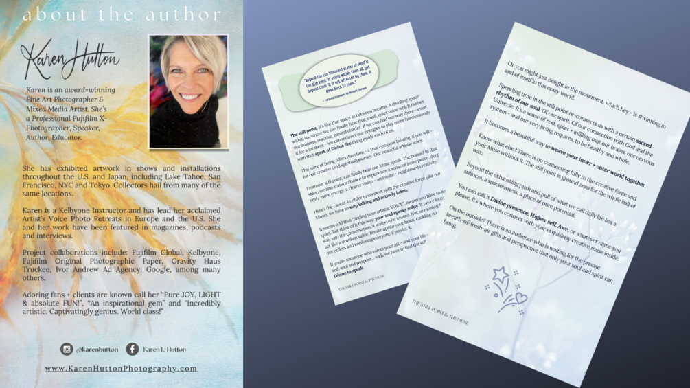 If you've ever wanted to connect with YOUR purpose, find your artistic voice in your Art or Photography, or even simply find some peace of mind in a world gone mad... this is the eBook for you. It's literally 5 pages long. And costs nothing. But it might just change your life.